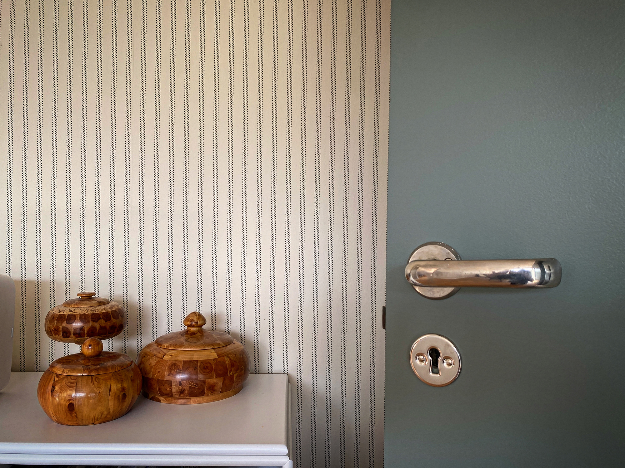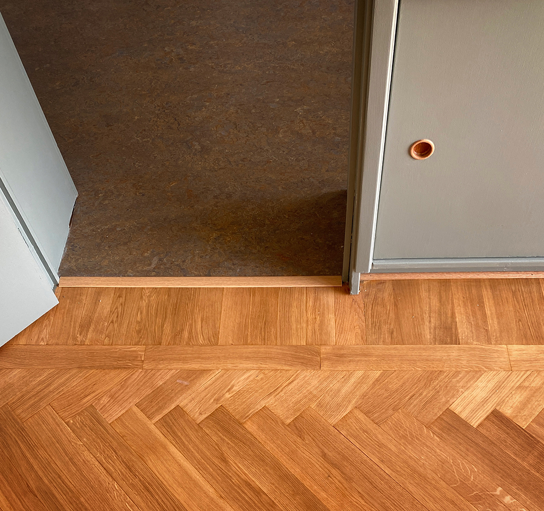 Den patinerade eklisten flankeras av en djupblå heltäckningsmatta i ull på ena sidan och en brun marmorerad linoleummatta på den andra