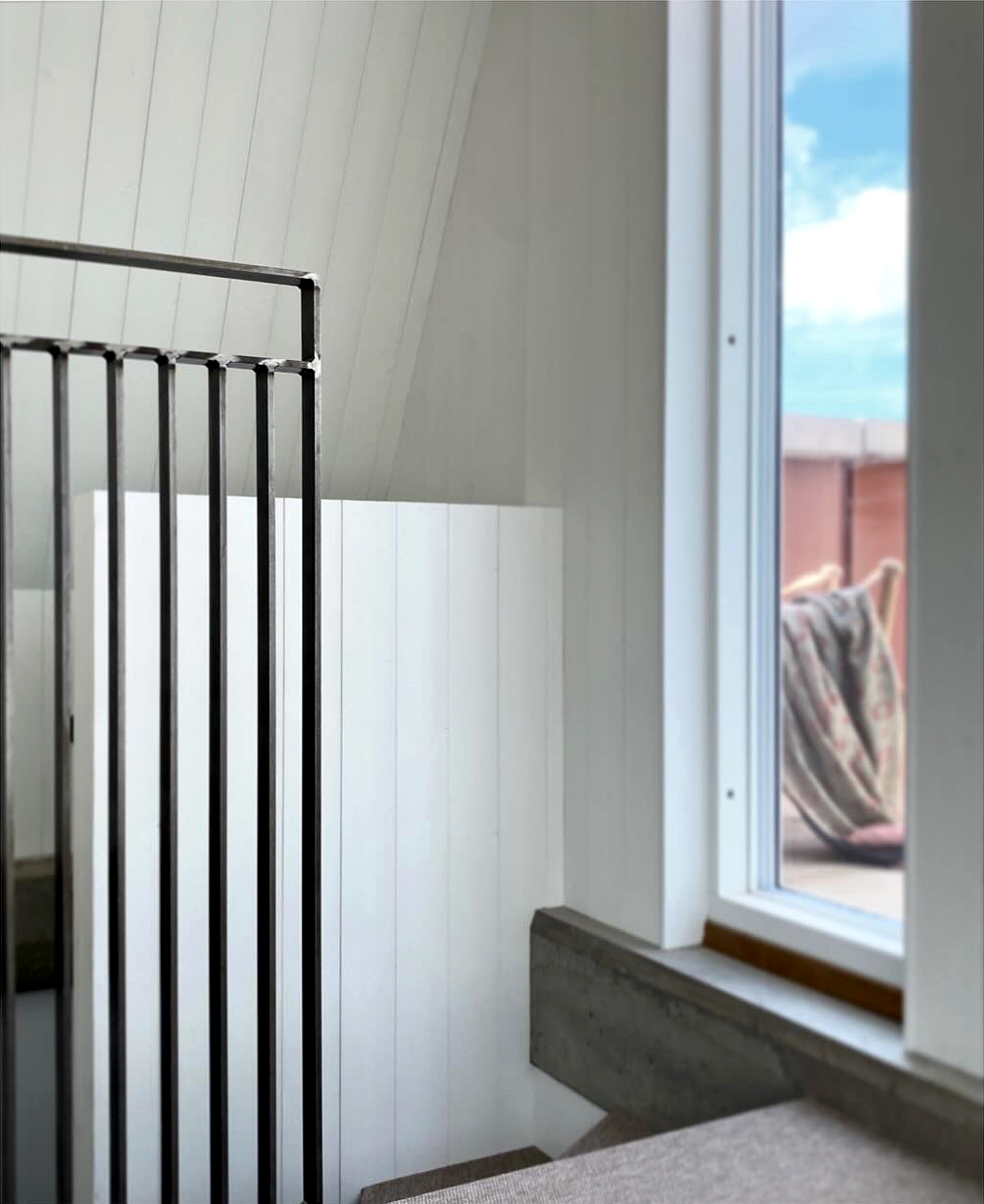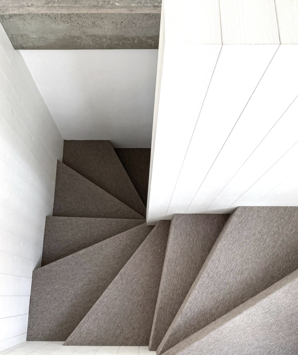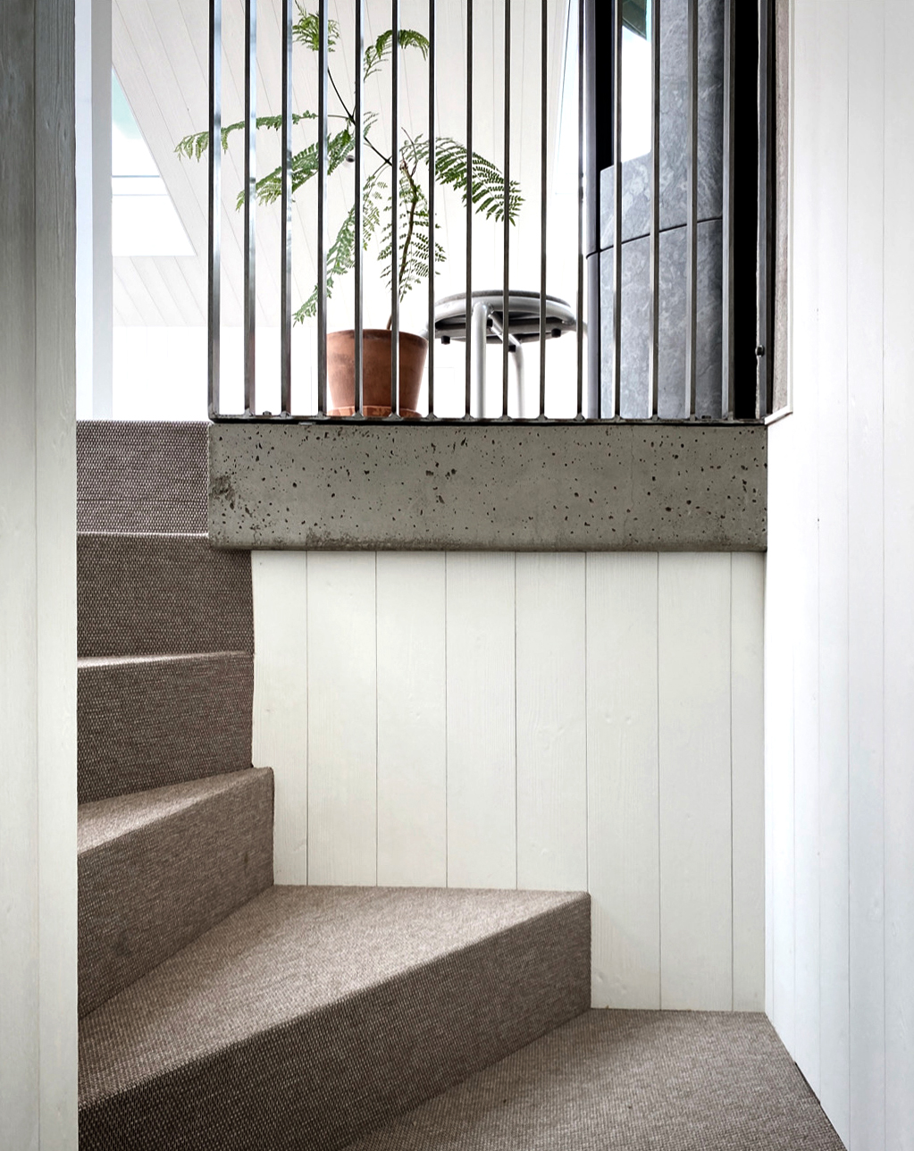 Upptag i betongbjälklag lämnades med synliga kanter och den vindlande trappan sveptes