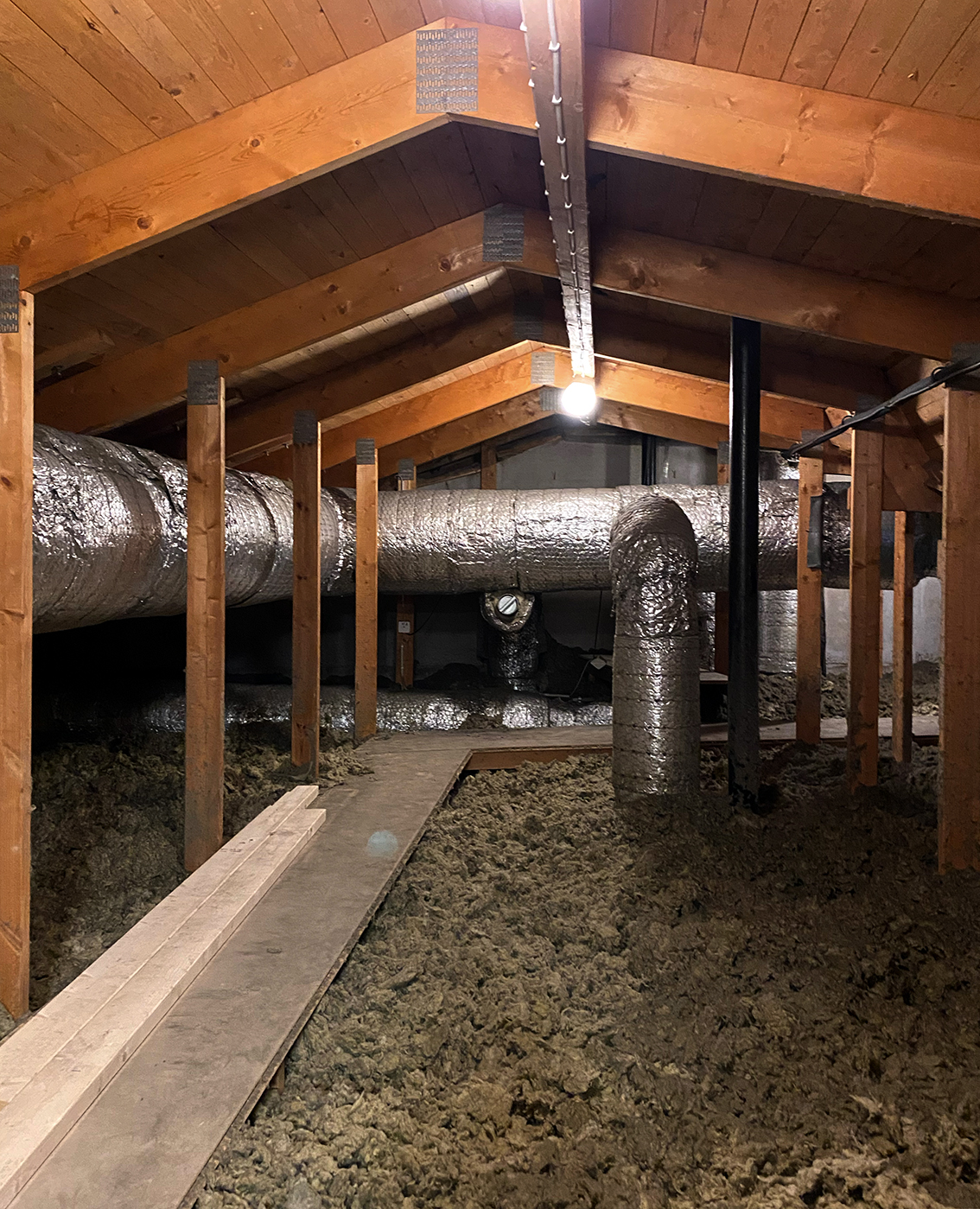 - Vindsbygge i ett hus från 1994 med en råvind full av isolering och ventilationstrummor.