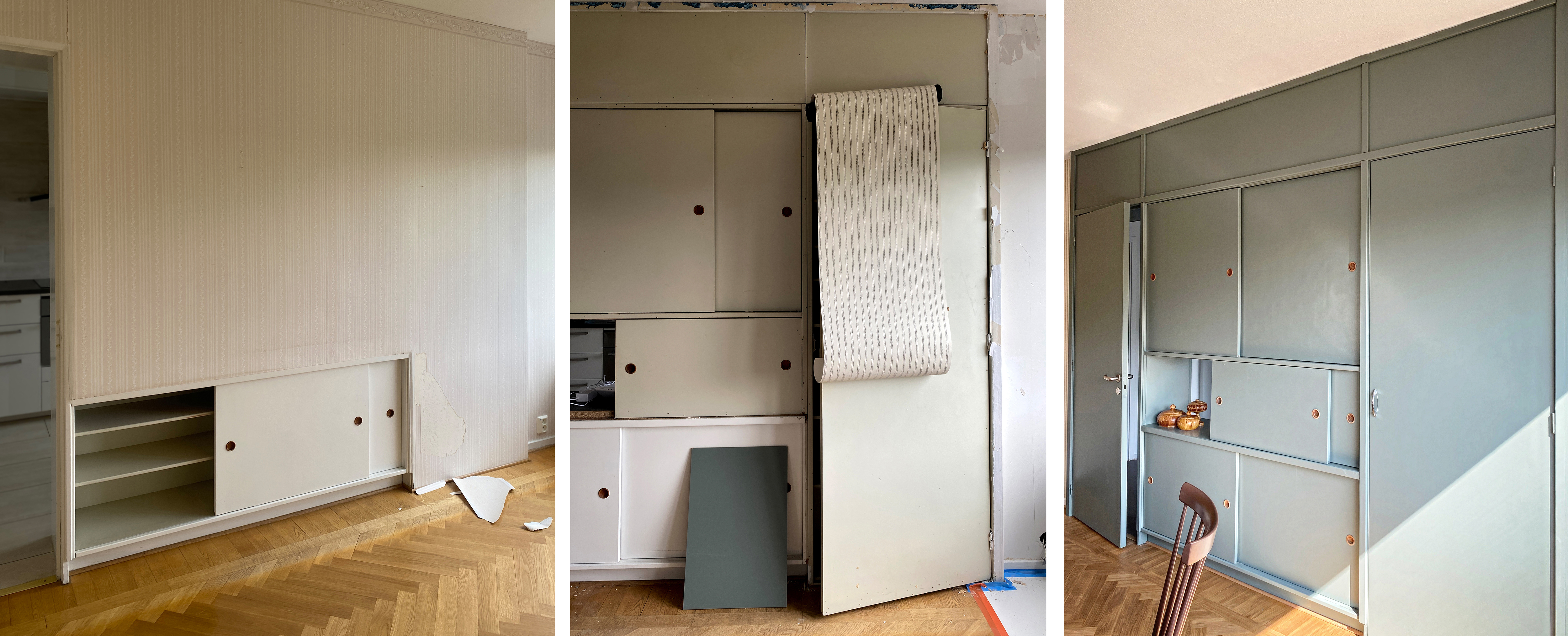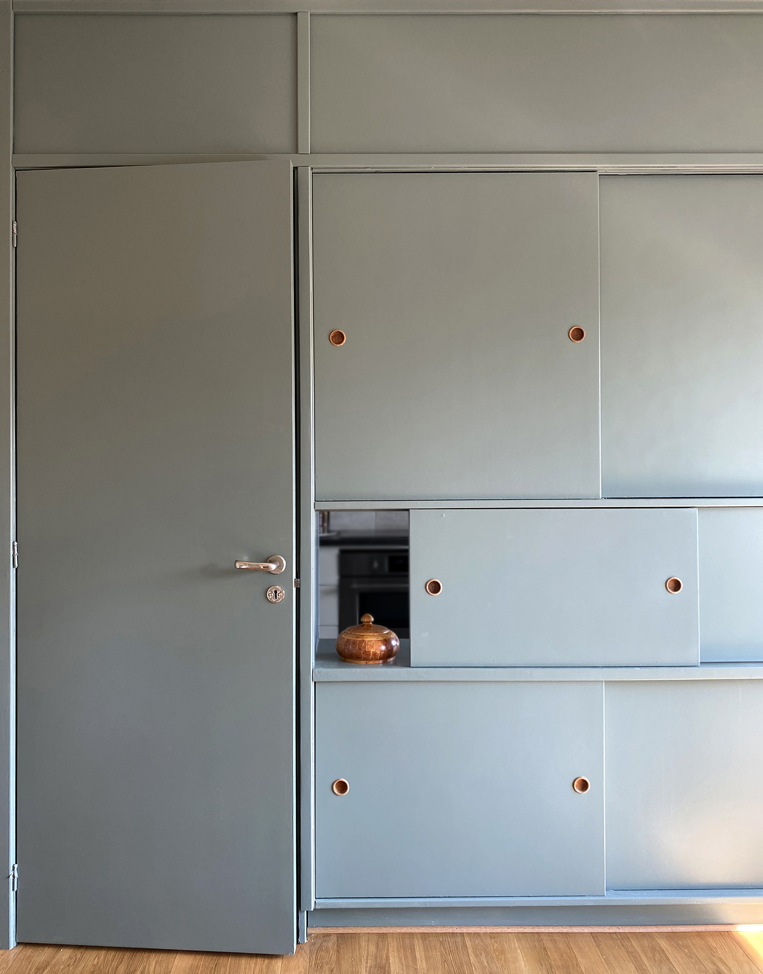 Det igenbyggda skåpet mellan matsal och kök frilades och målades i NCS S-5005-G20Y