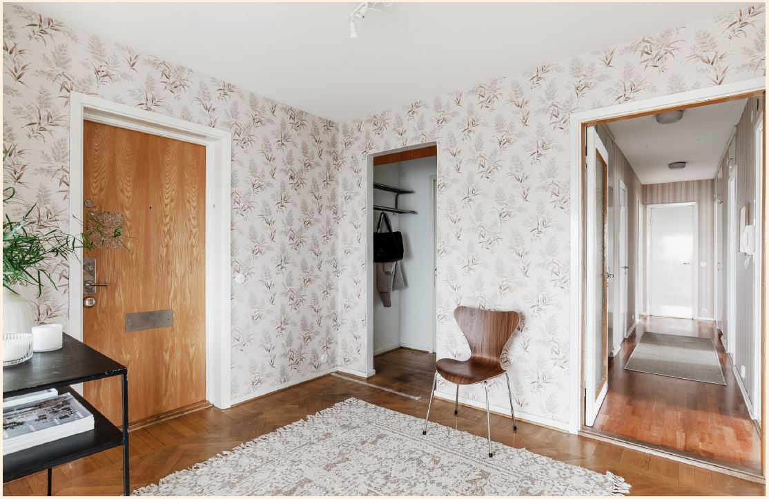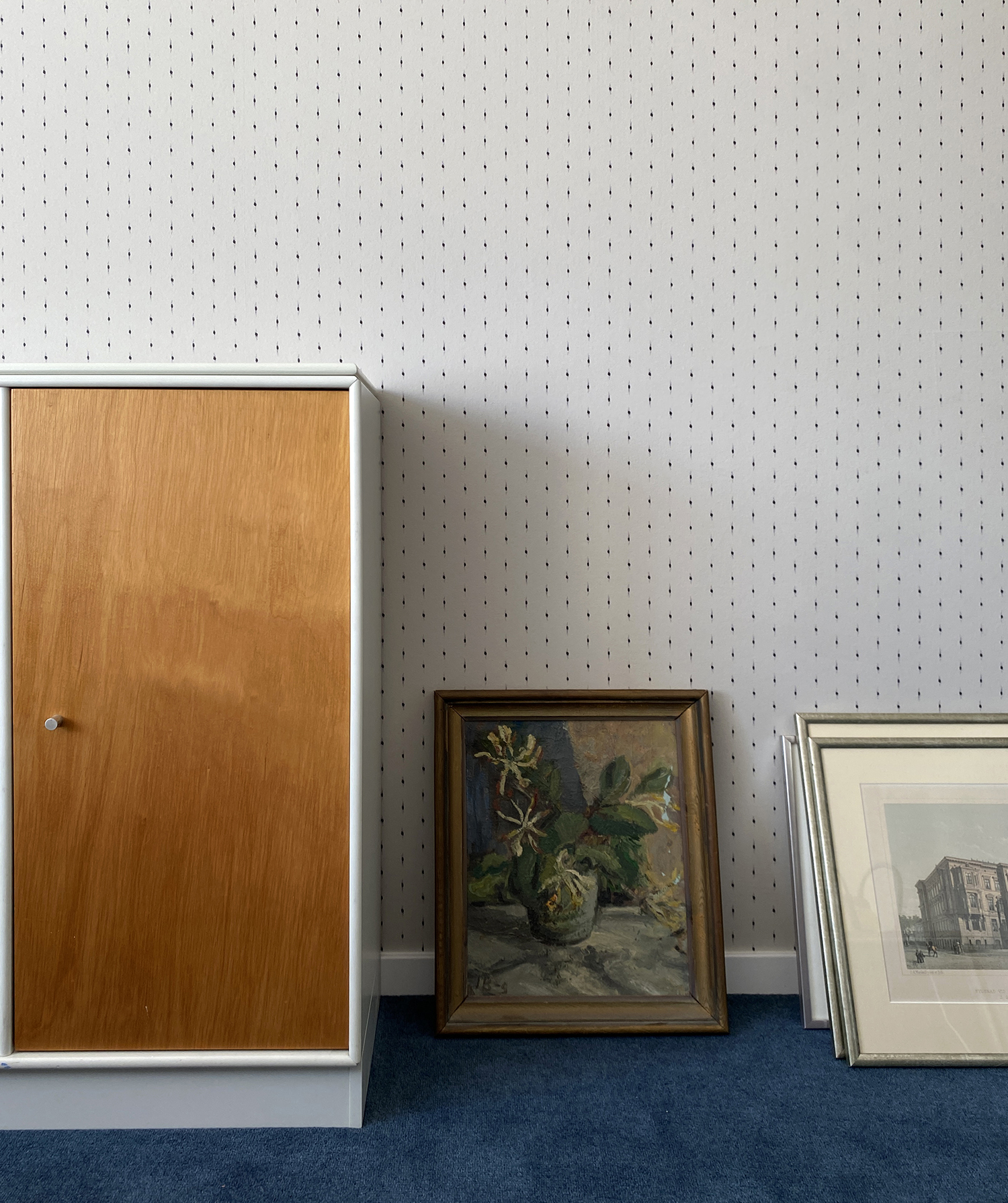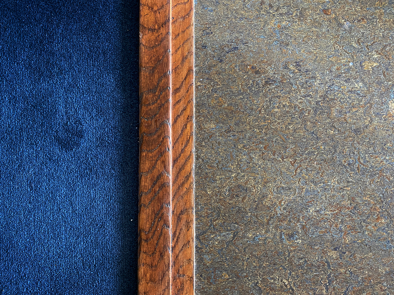 Den patinerade eklisten flankeras av en djupblå heltäckningsmatta i ull på ena sidan och en brun marmorerad linoleummatta på den andra