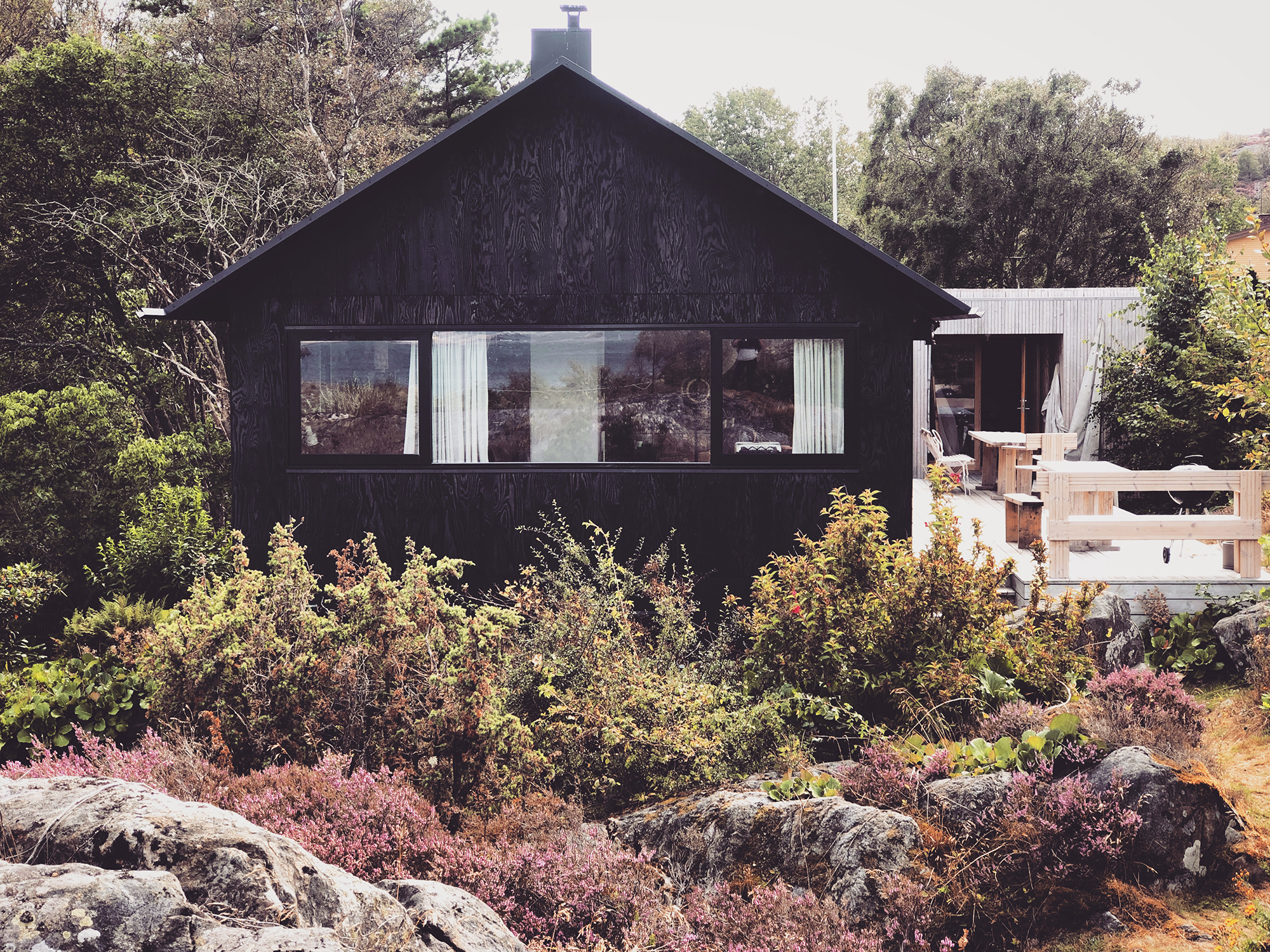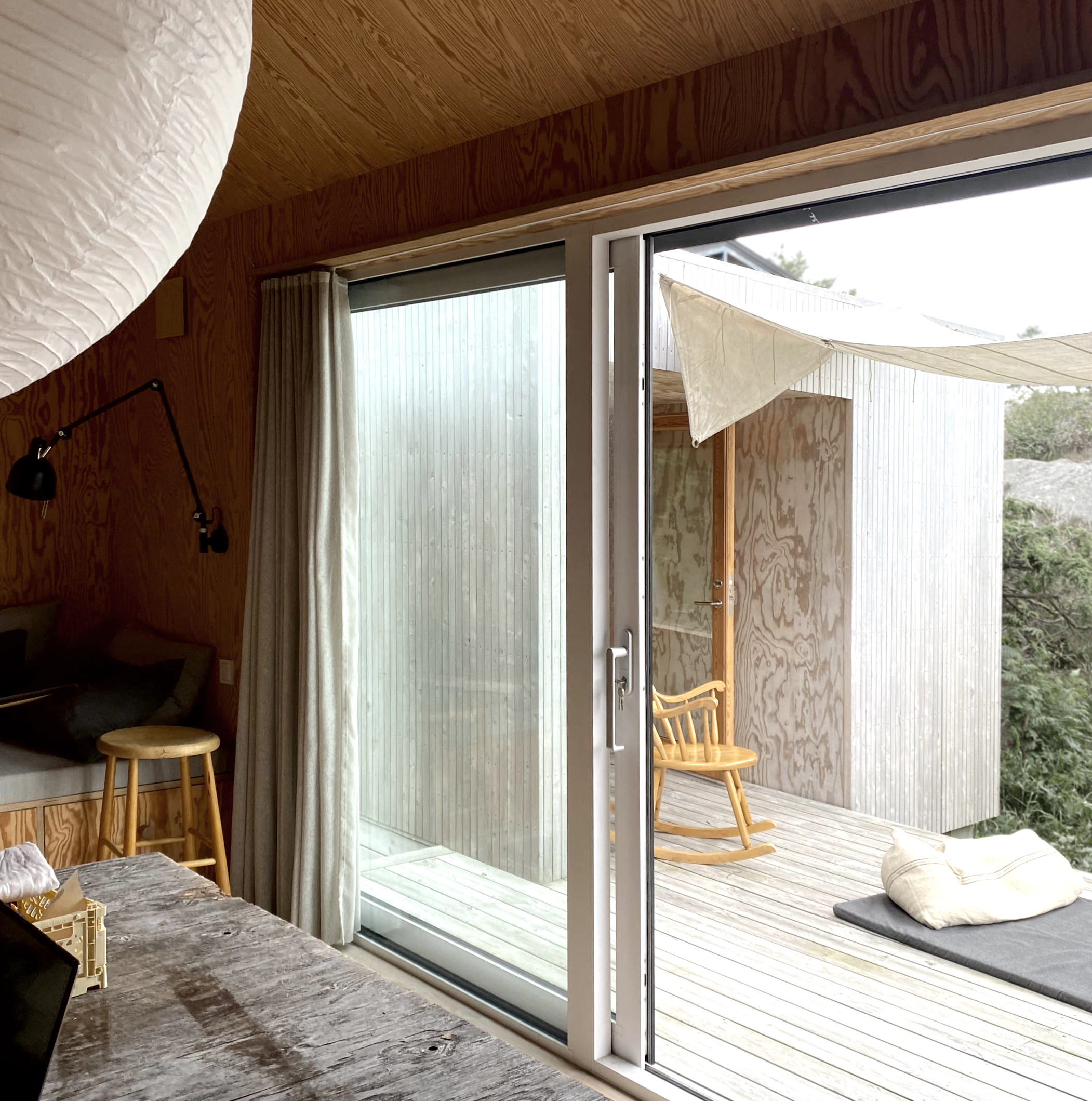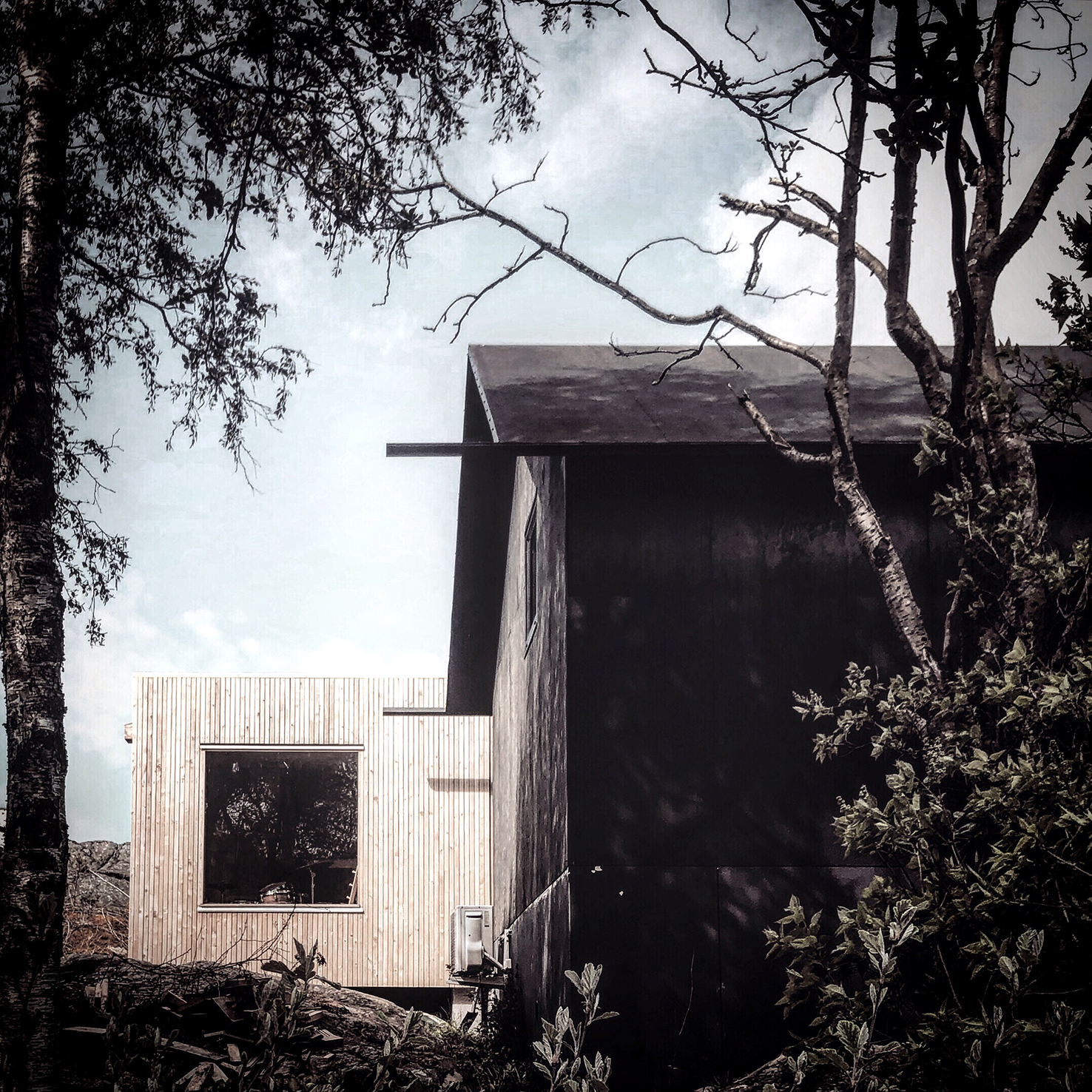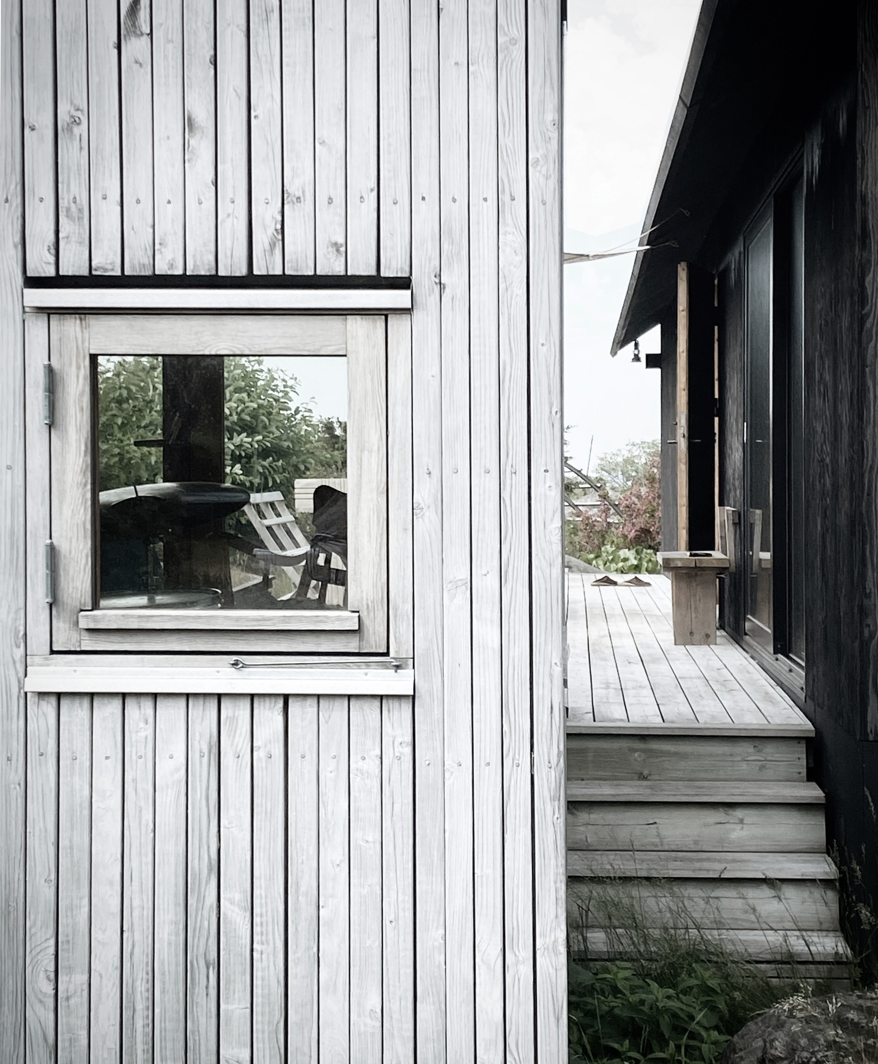 - Gästhuset är placerat vid kortsidan av altanen och skapar en gårdsformation med huvudhuset. Tillägget på 15 kvm ger två sovkojer, en toalett och en väderskyddad förlängning av altanens rum. Gästhuset kopplas form- och materialmässigt till altanen och låter det svarta huvudhuset råda i siluett och form.