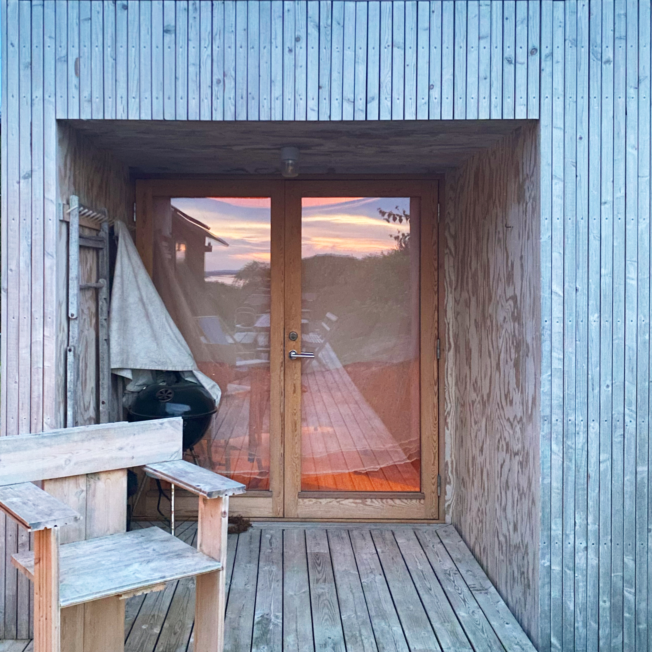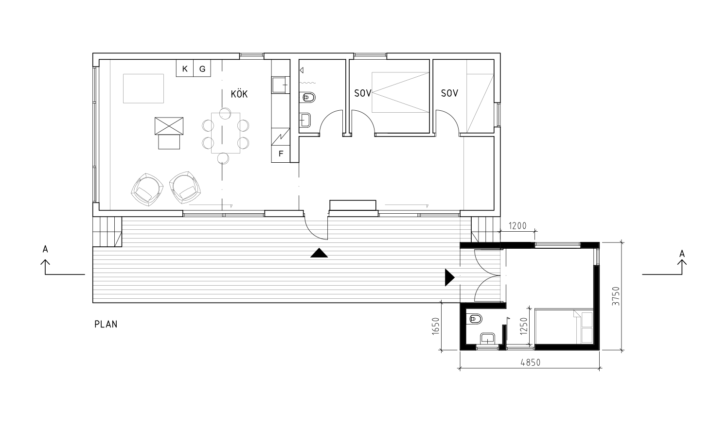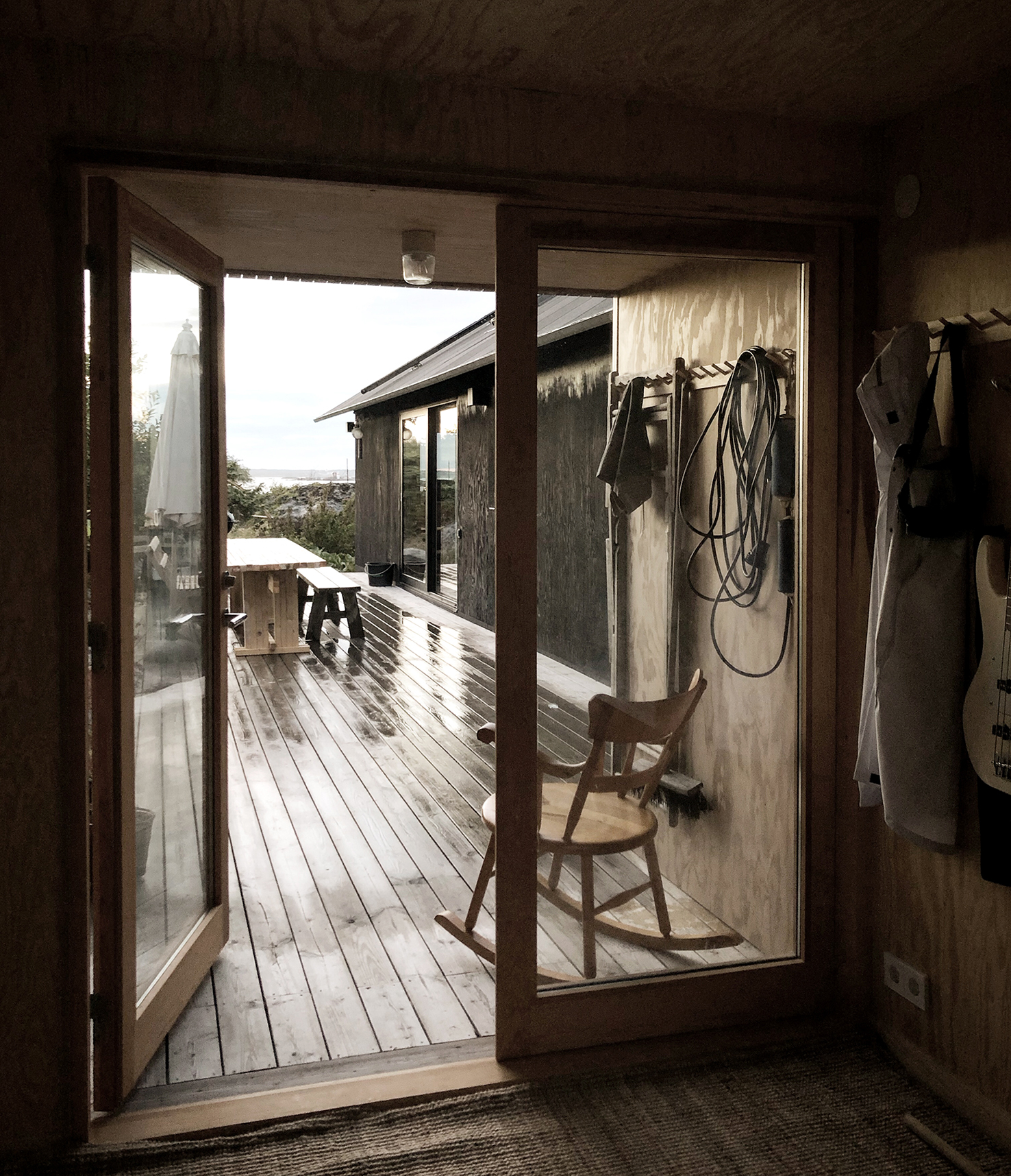 - Gästhuset är placerat vid kortsidan av altanen och skapar en gårdsformation med huvudhuset. Tillägget på 15 kvm ger två sovkojer, en toalett och en väderskyddad förlängning av altanens rum. Gästhuset kopplas form- och materialmässigt till altanen och låter det svarta huvudhuset råda i siluett och form.