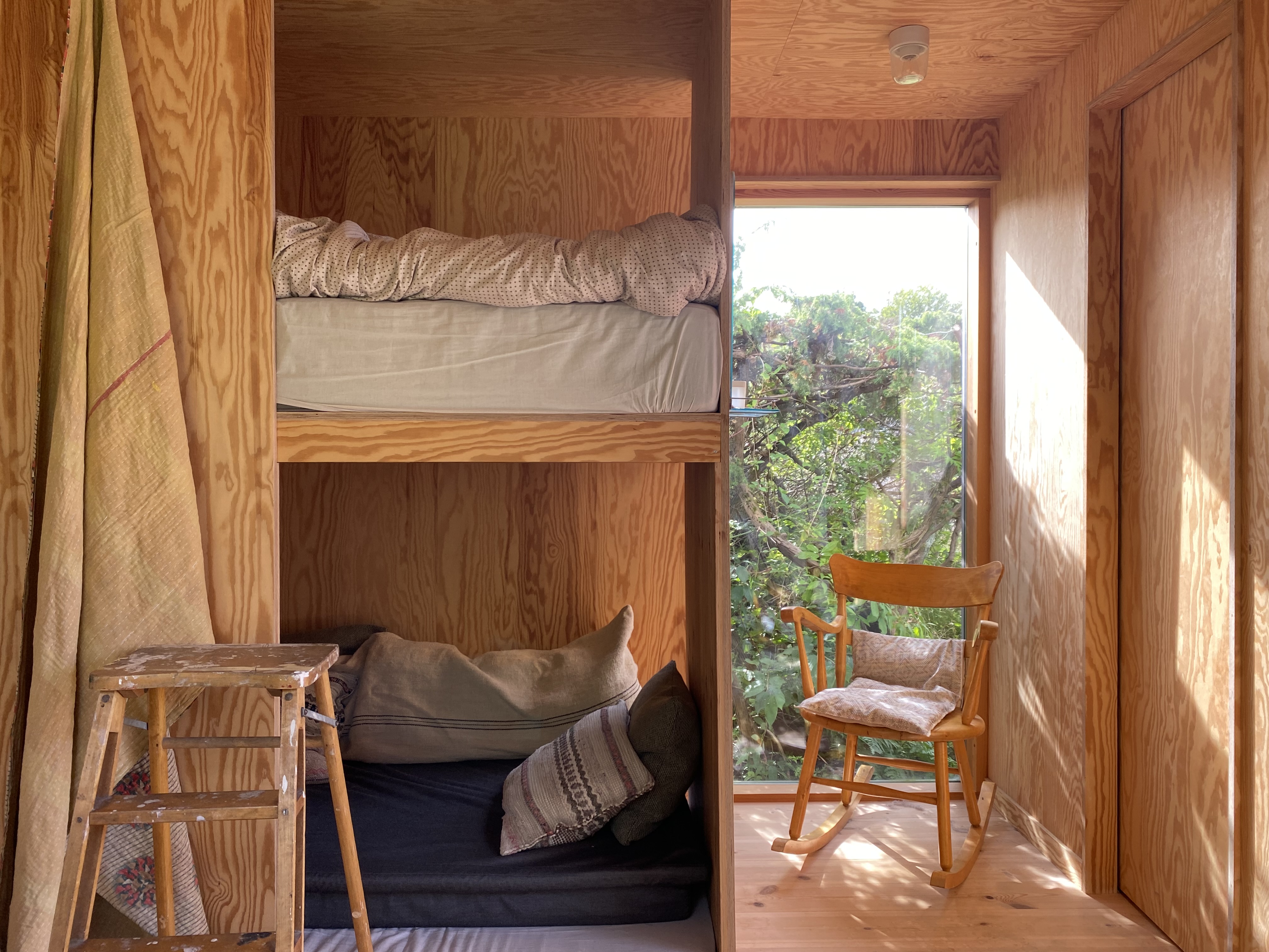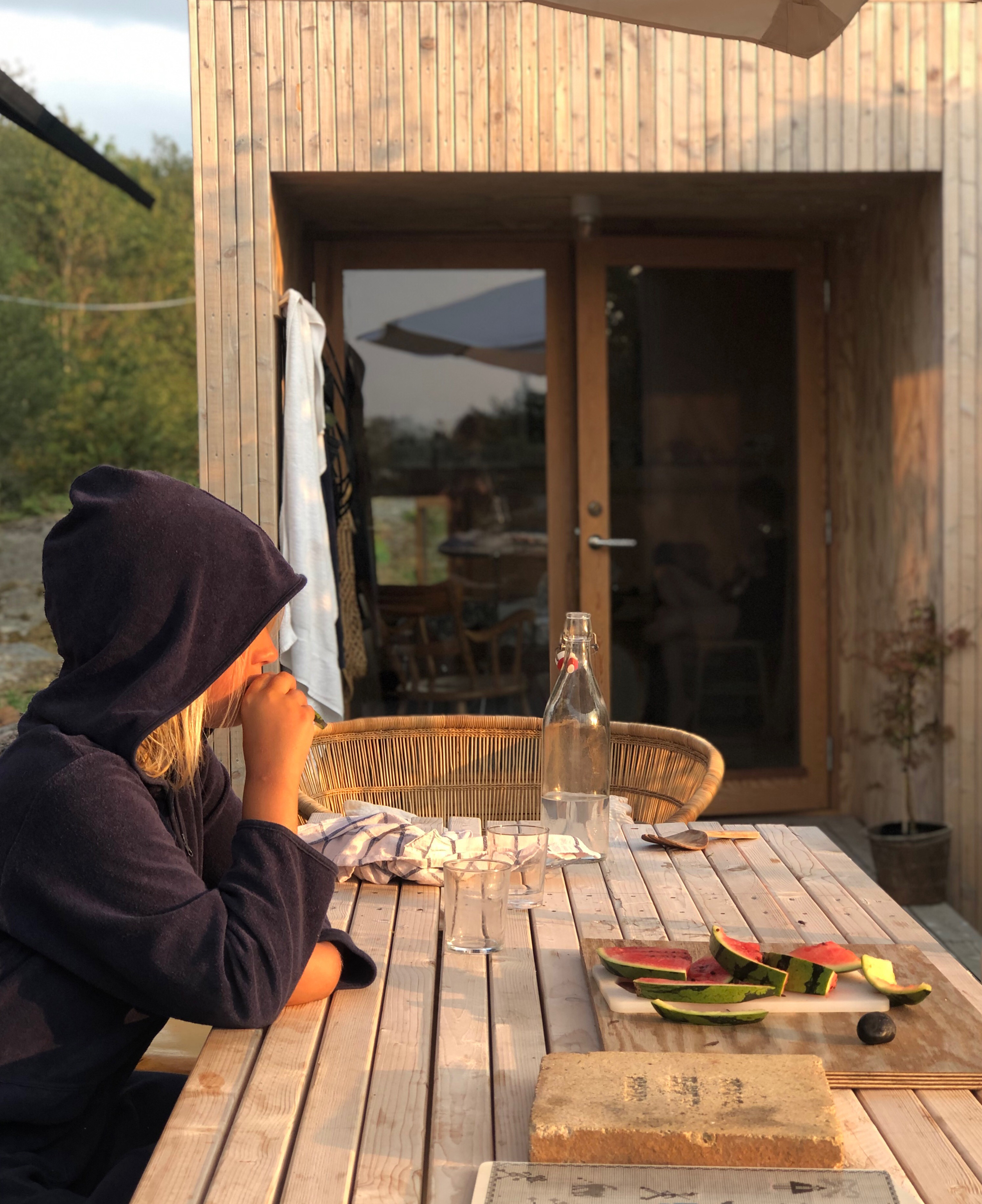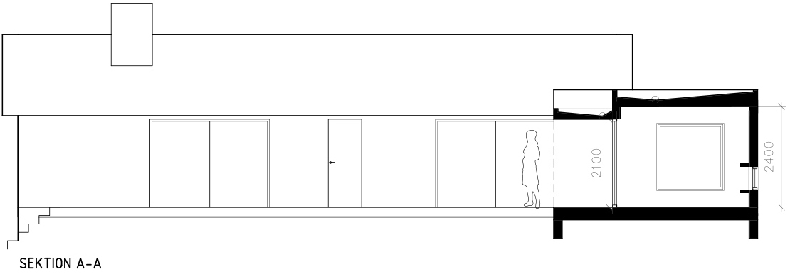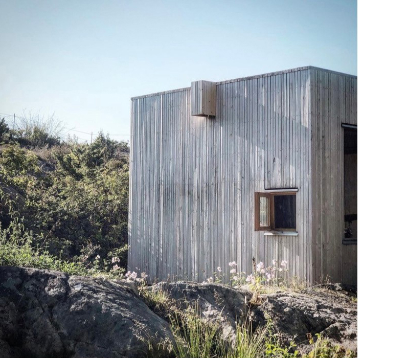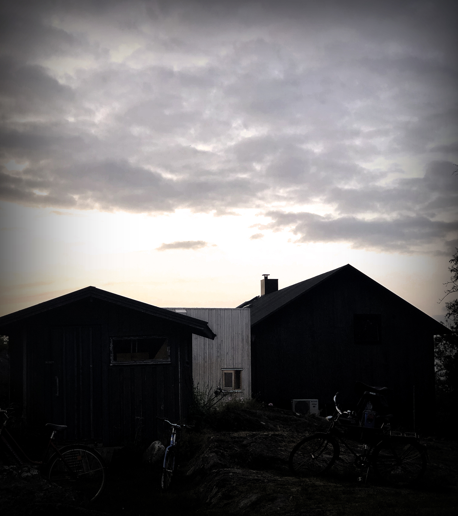 - Gästhuset är placerat vid kortsidan av altanen och skapar en gårdsformation med huvudhuset. Tillägget på 15 kvm ger två sovkojer, en toalett och en väderskyddad förlängning av altanens rum. Gästhuset kopplas form- och materialmässigt till altanen och låter det svarta huvudhuset råda i siluett och form.