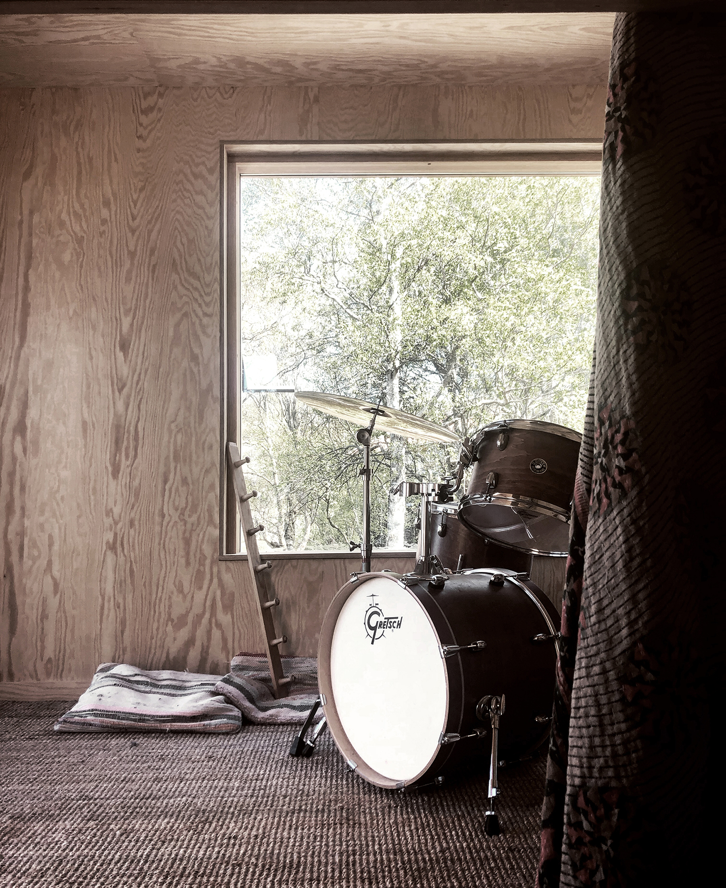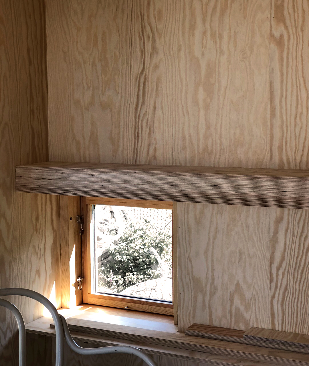 Utvändigt är huset klätt med 45x45 furureglar såväl på tak som på väggar. Invändigt kläs ytorna av furuplywood som också utgör den fasta inredningen med sovkojer och vägghyllor.