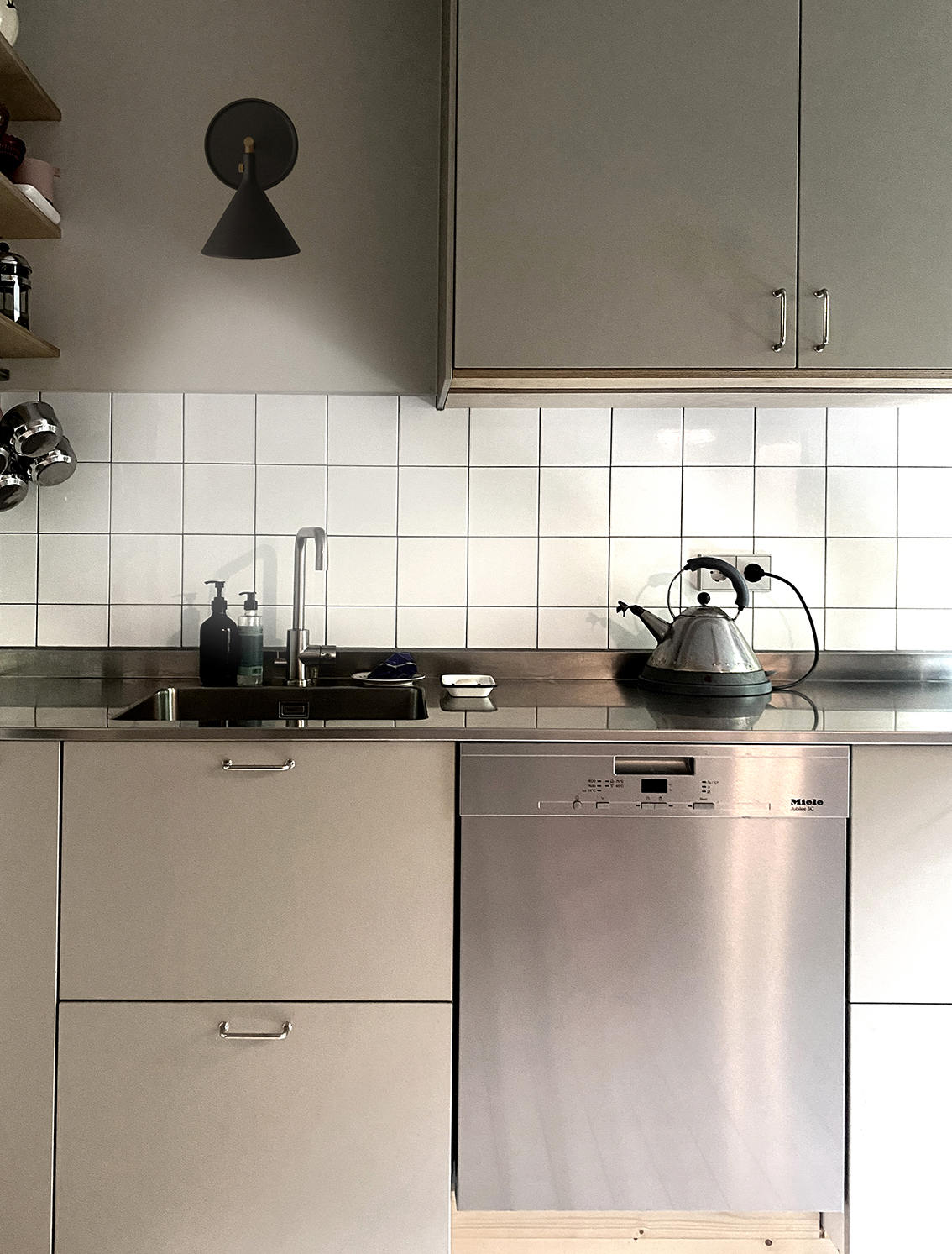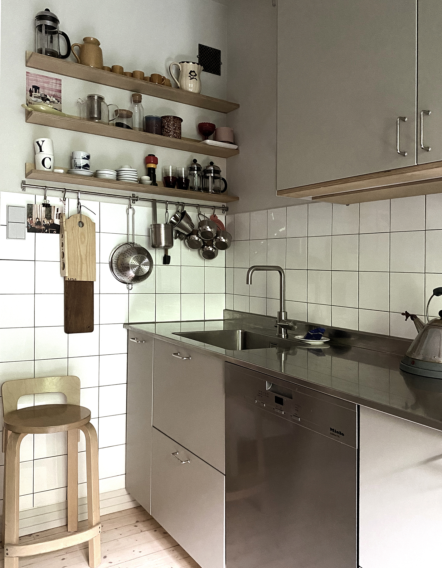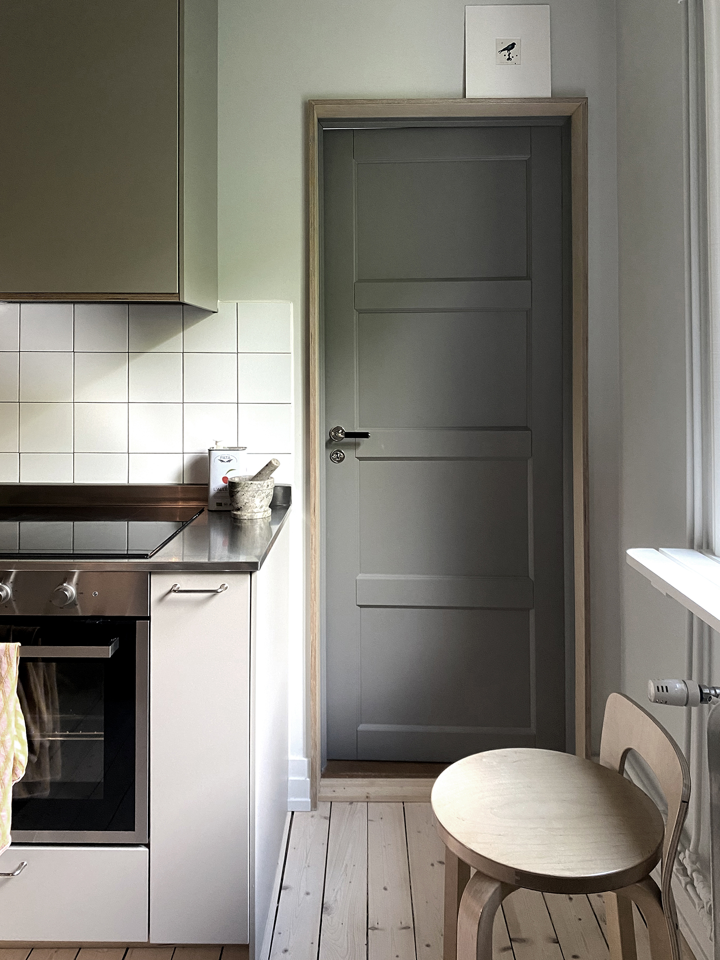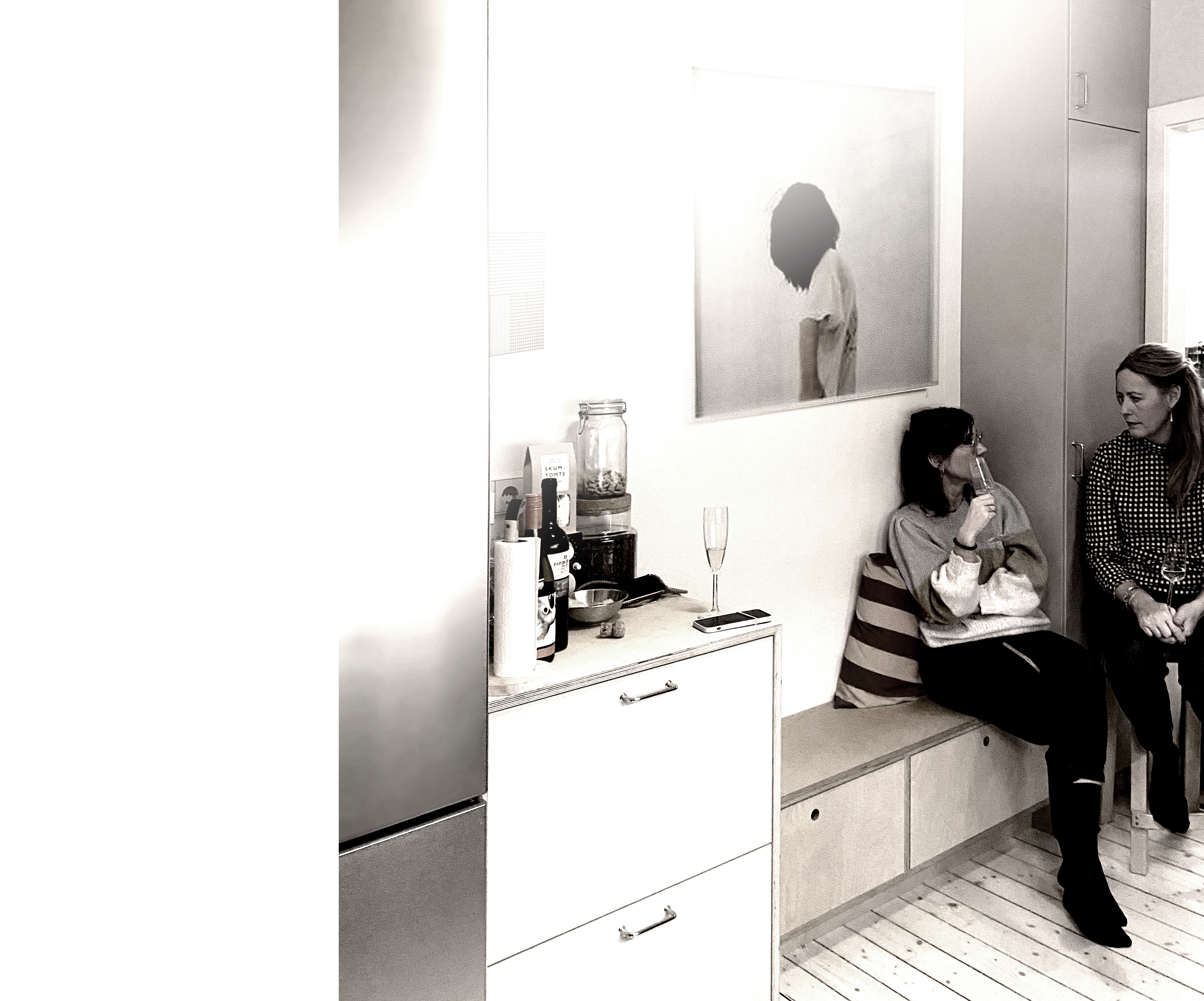 - Köket i det gamla landshövdingehuset saknade såväl sittyta som arbetsyta. Genom att flytta kylskåpet och putta ut spishäll och ugn mot kanten vann den sammanhängande arbetsytan 60 cm. Kylskåpet placerades bredvid det gamla kallskafferiet och blev en och samma enhet med hjälp av ett ramverk av björkplywood. Den tidigare utstickande köksön ersattes med en längsgående sittbänk. Bänken länkar samman högskåp, bänkskåp, kylskåp och skafferi till en lekfull komposition och lämnar även plats för en väggyta för egen utsmyckning.