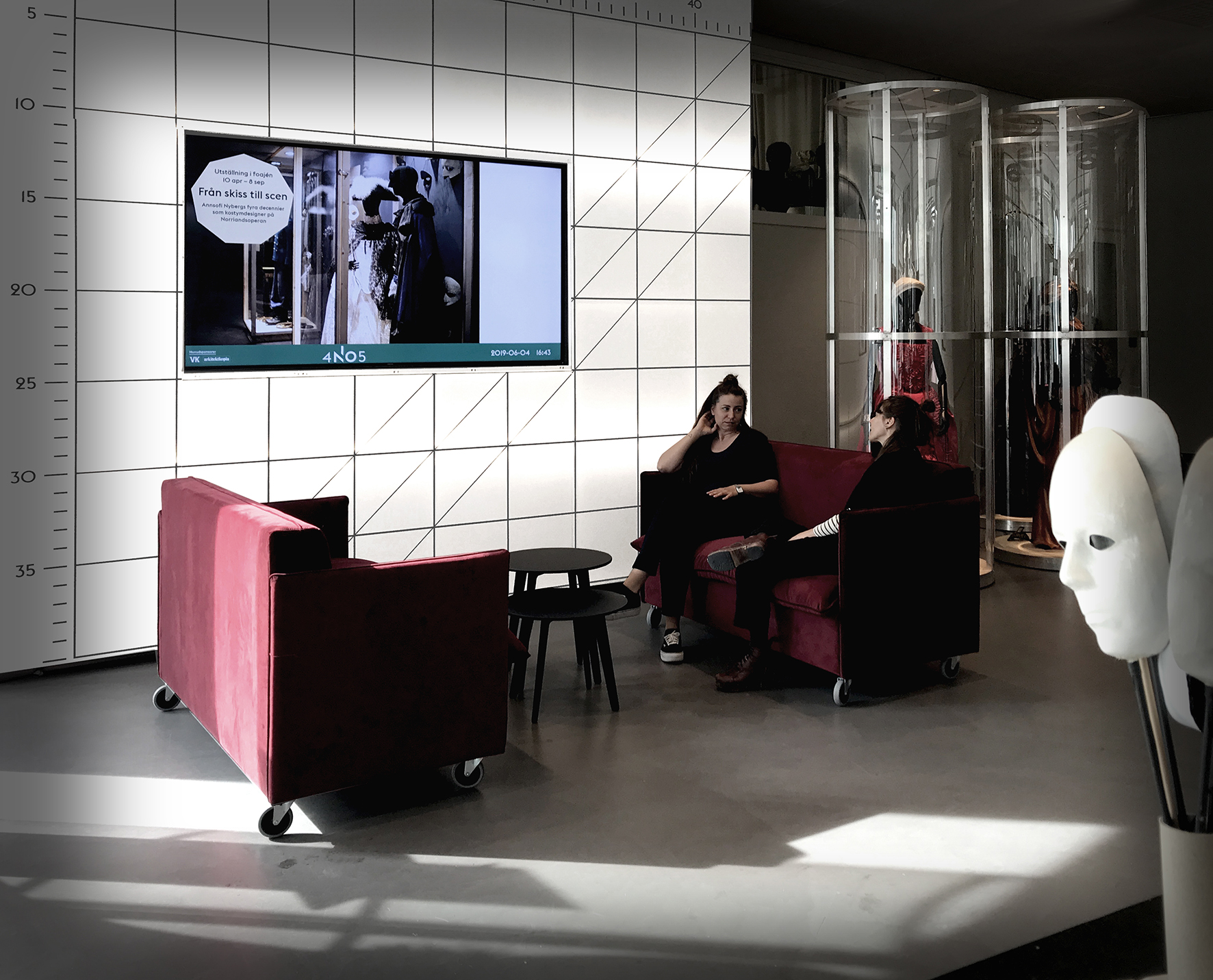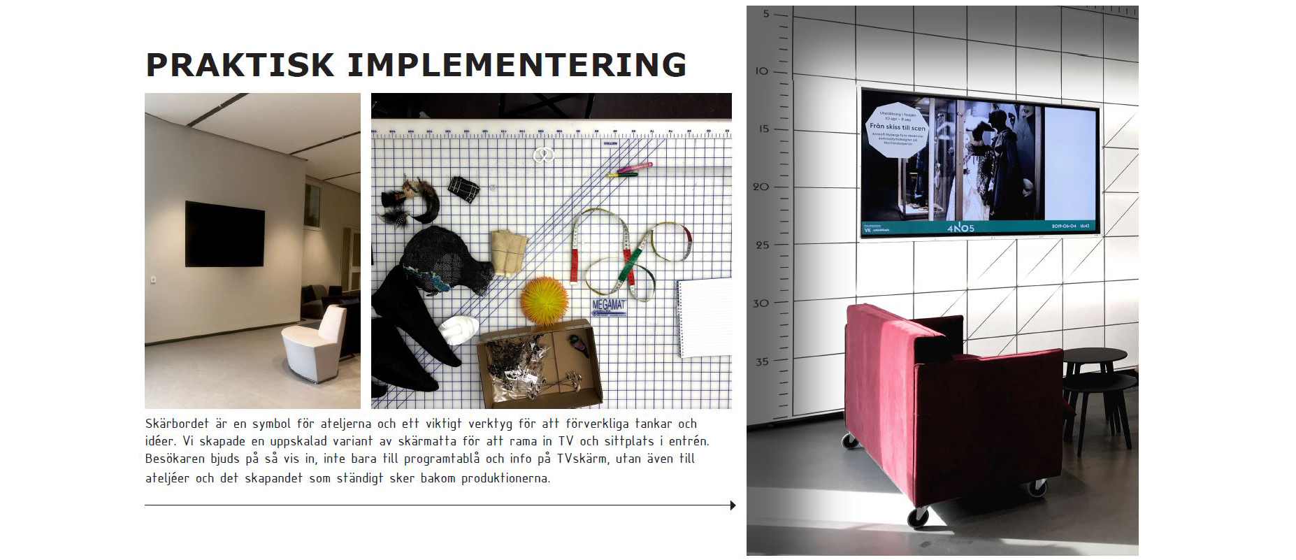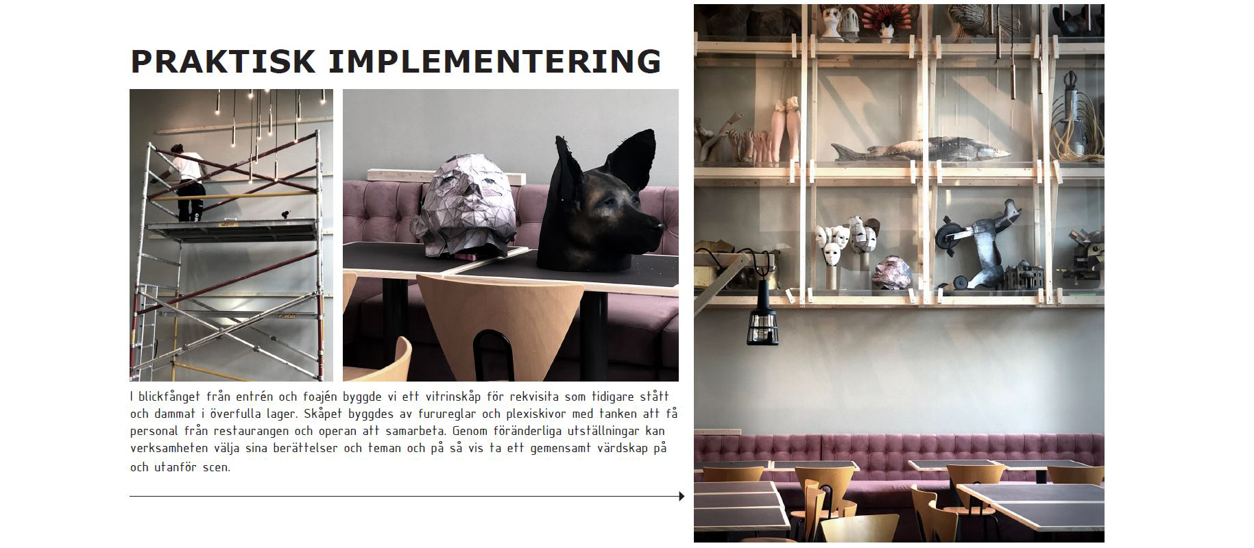 - Konceptet "The scenes behind the scenes" syftar till att lyfta fram backstage-verksamheterna och bjuda in allmänheten i de kreativa processerna. Genom att inreda de publika rummen med rekvisita och scenografi, inte bara synliggjorde vi och tog till vara på befintlig material, vi bjöd även in personalen i huset att engagera sig i gästytorna som driftades av extern aktör.
