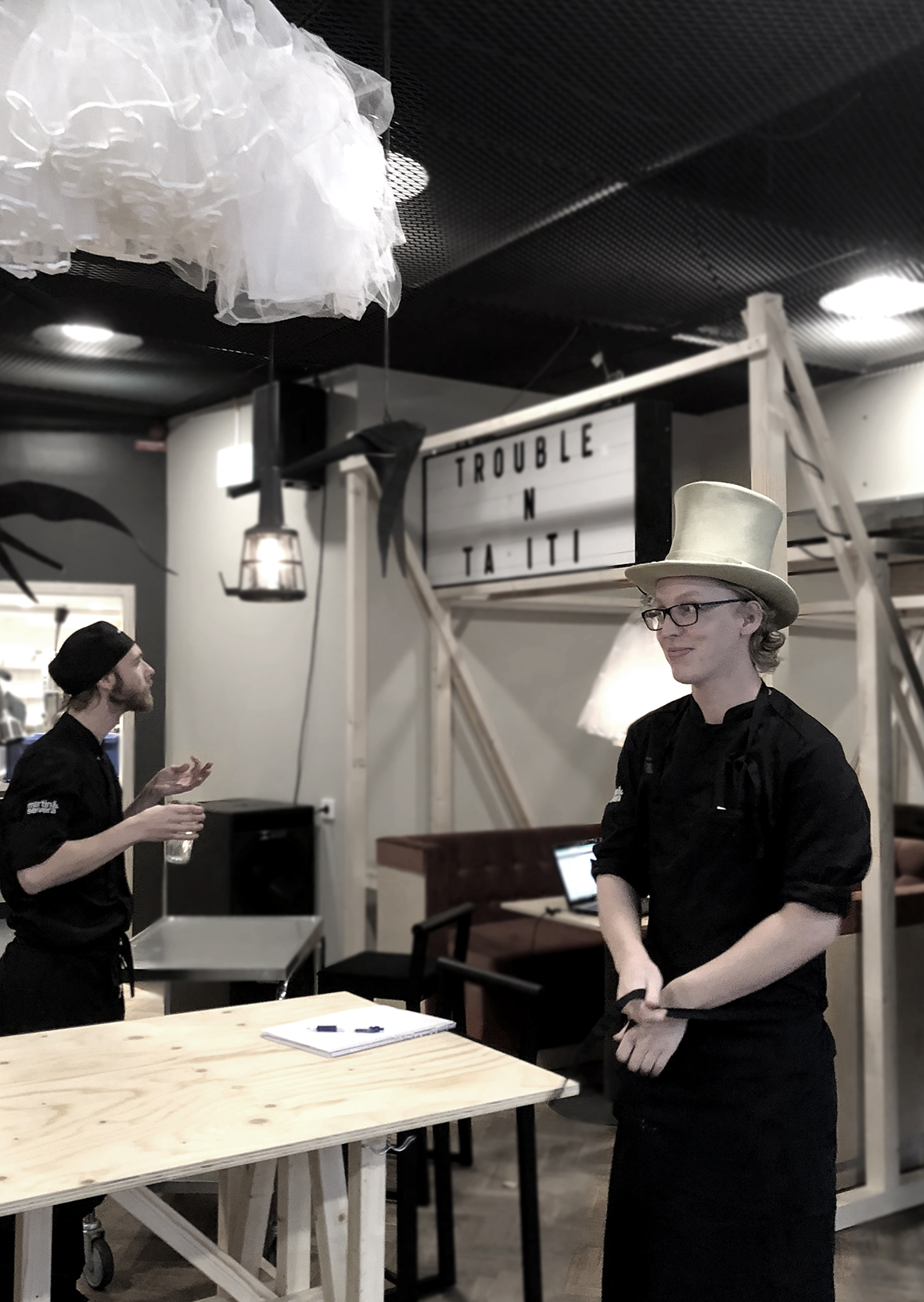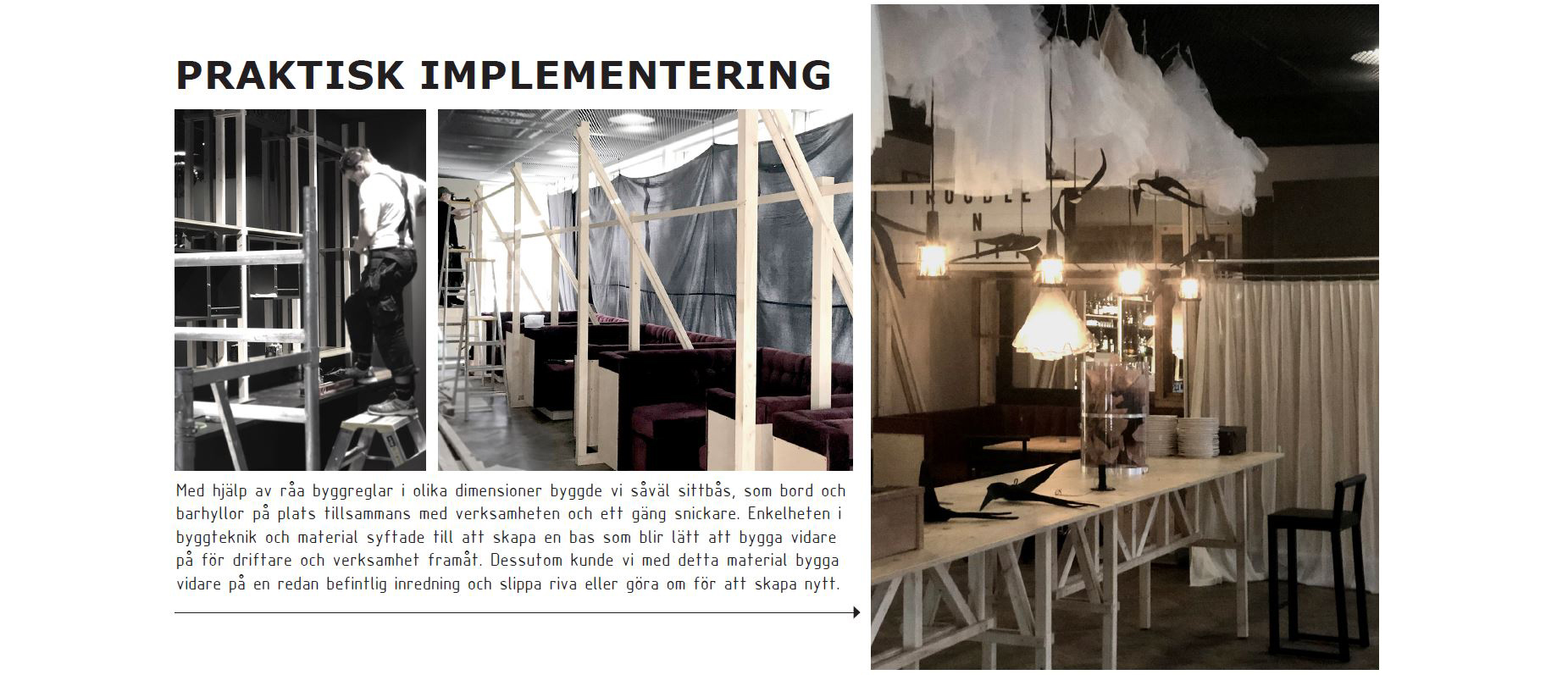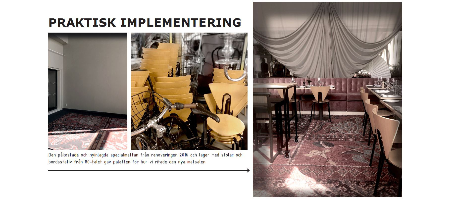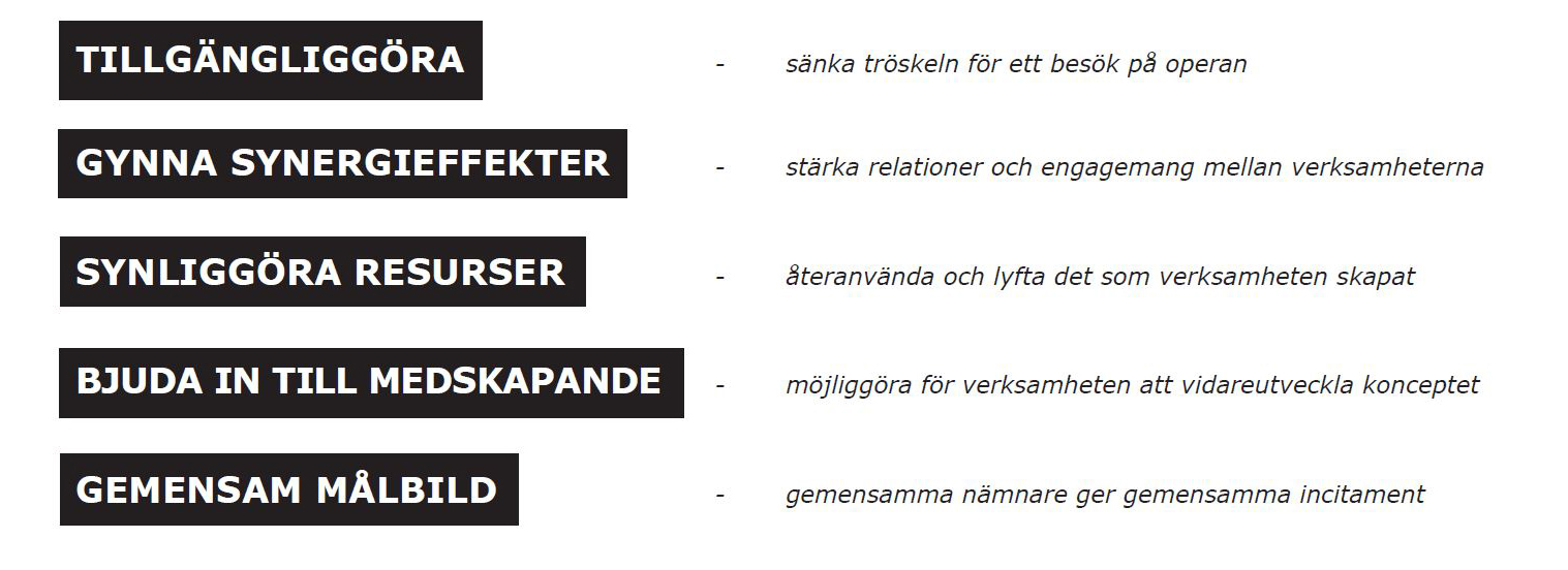 - Konceptet "The scenes behind the scenes" syftar till att lyfta fram backstage-verksamheterna och bjuda in allmänheten i de kreativa processerna. Genom att inreda de publika rummen med rekvisita och scenografi, inte bara synliggjorde vi och tog till vara på befintlig material, vi bjöd även in personalen i huset att engagera sig i gästytorna som driftades av extern aktör.