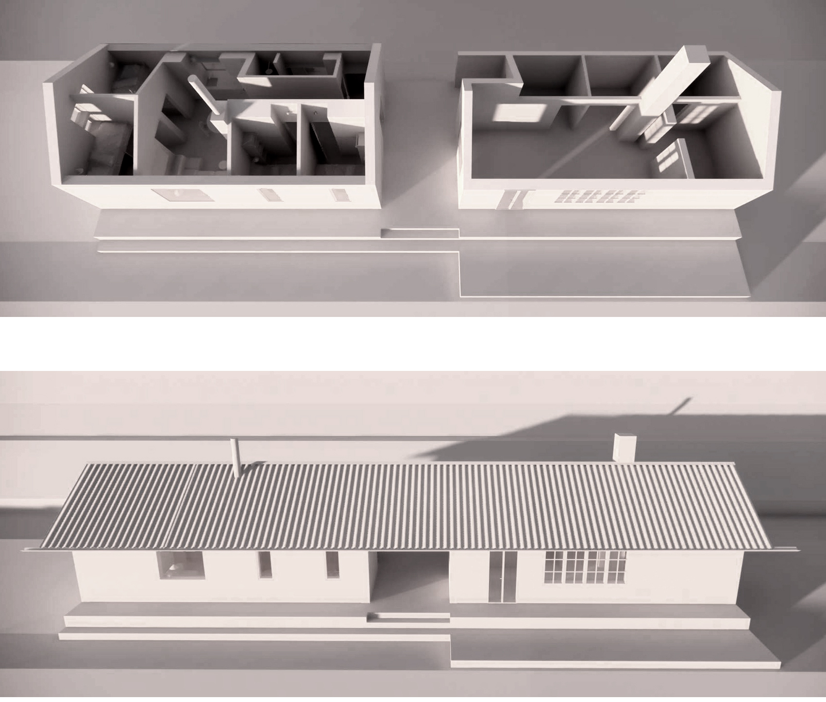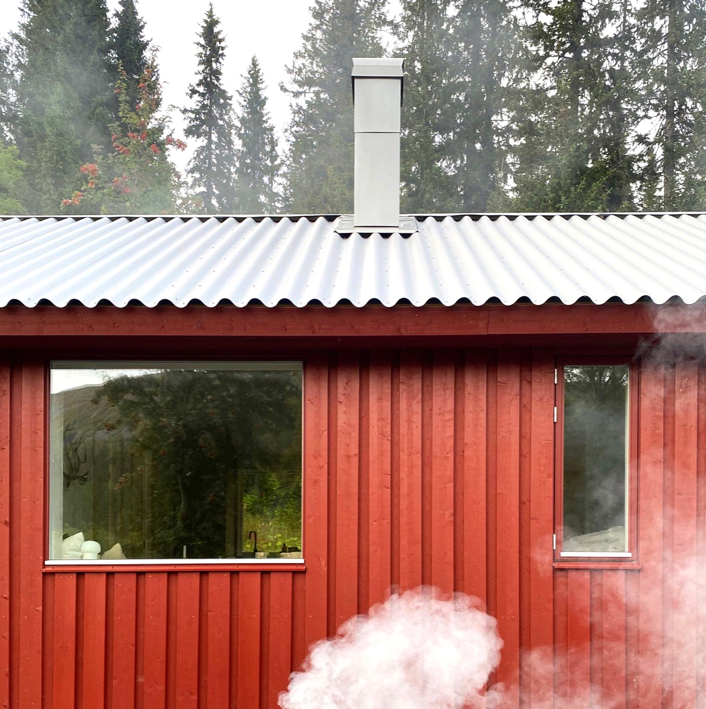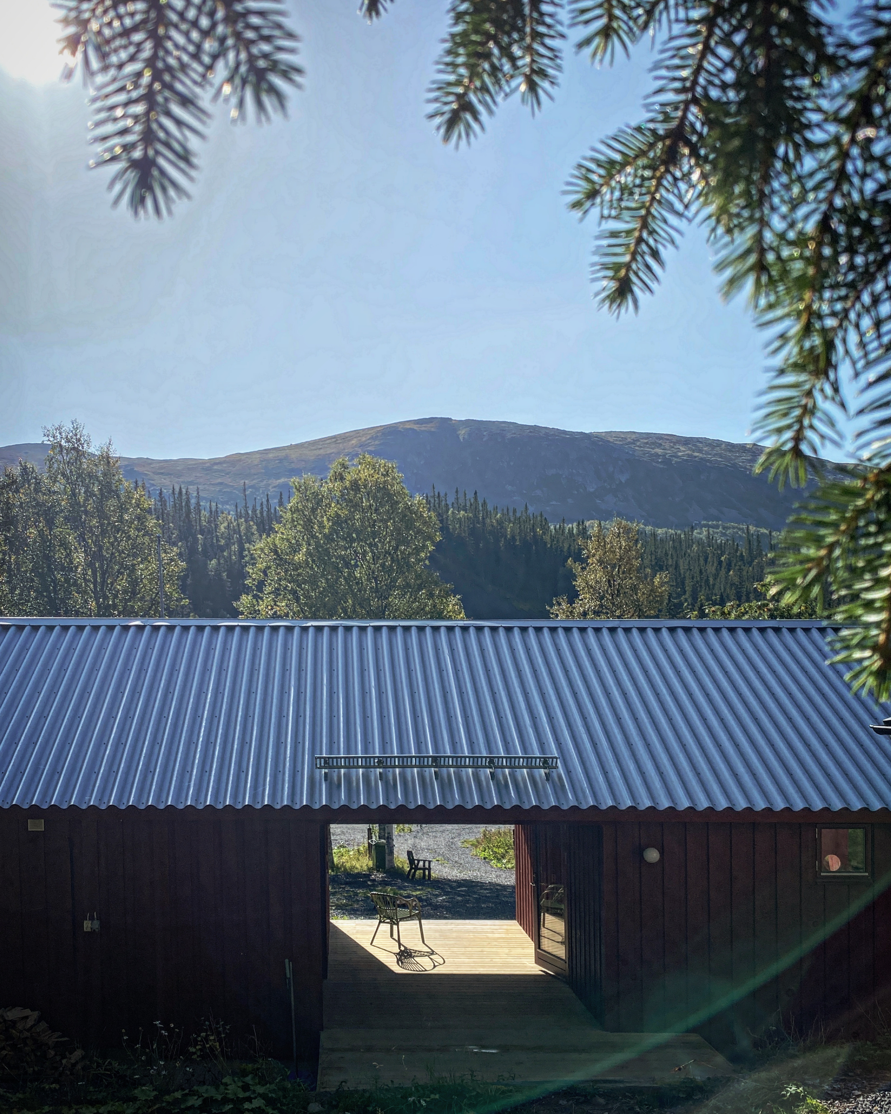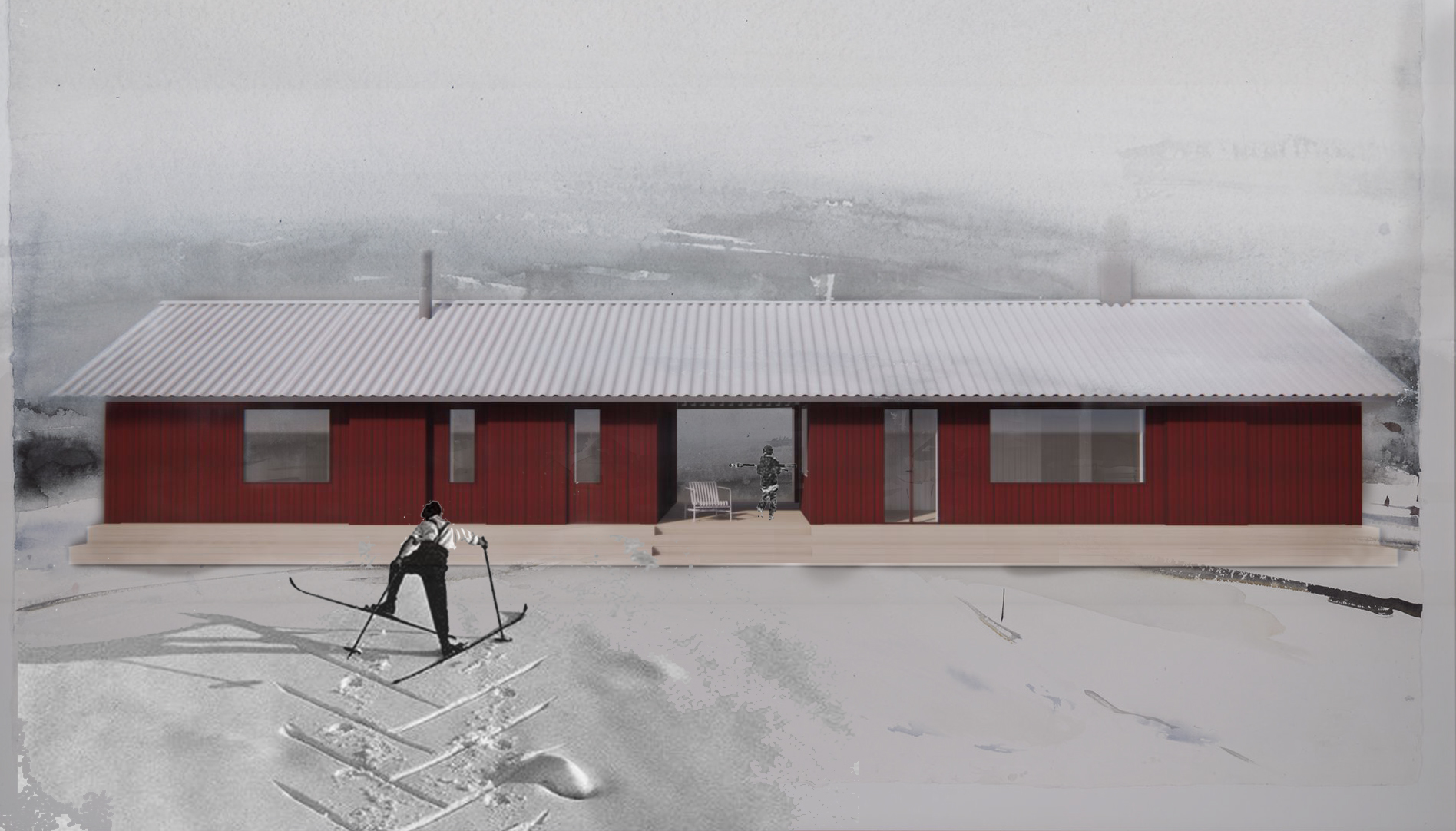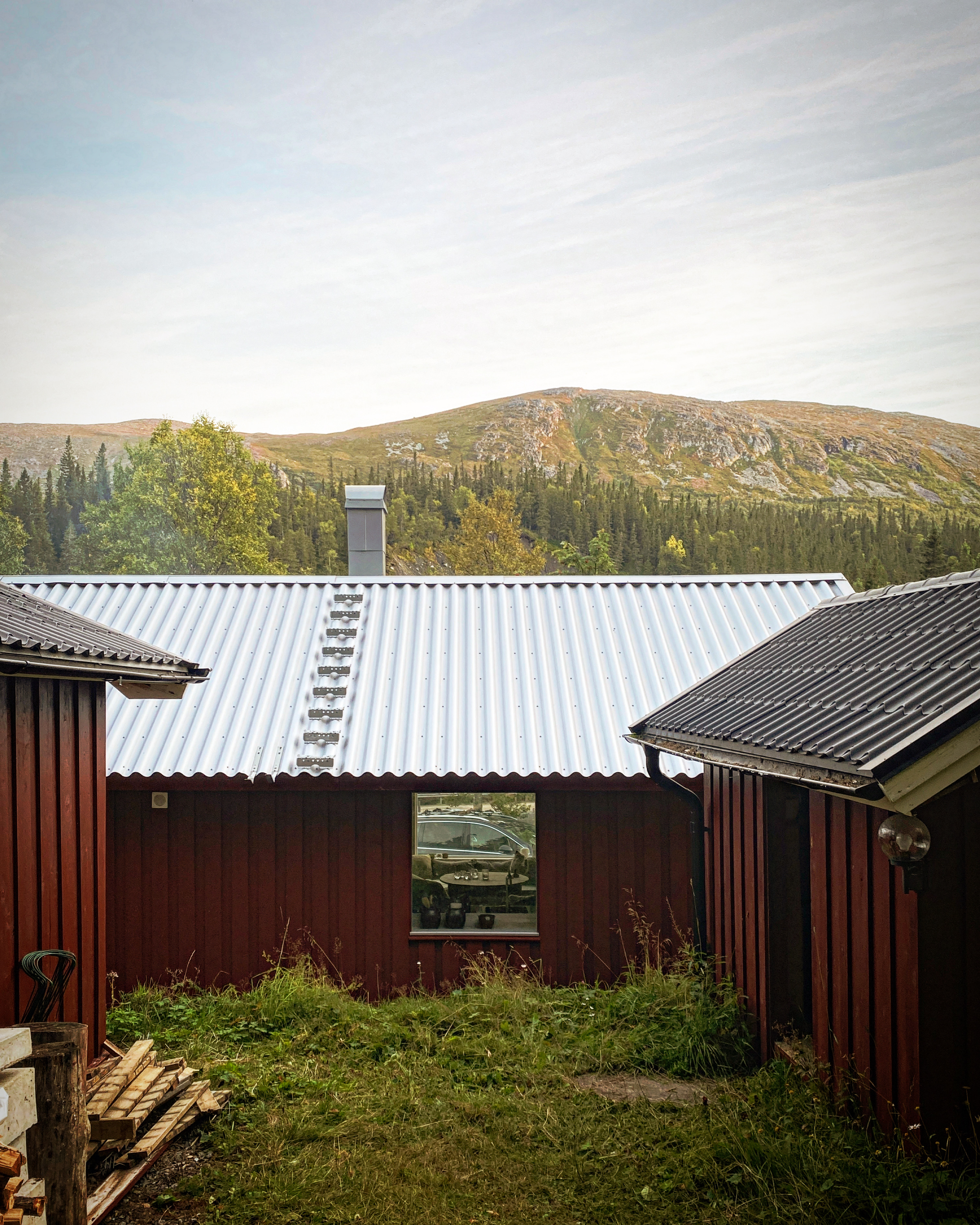 Den nya huskroppen ansluter till det befintliga huset via ett trädäck och överbyggnaden täcks av ett gemensamt tak vilket både skapar en väderskyddad plats och en känsla av att husen hänger ihop trots att de fungerar som två separata. Förutom kontakt och kommunikation syftar öppningarna och fönstersättningen till att skapa siktlinjer mellan berg och skog, ett sätt att både skapa närvaro till den omgivande naturen och underordna sig den.